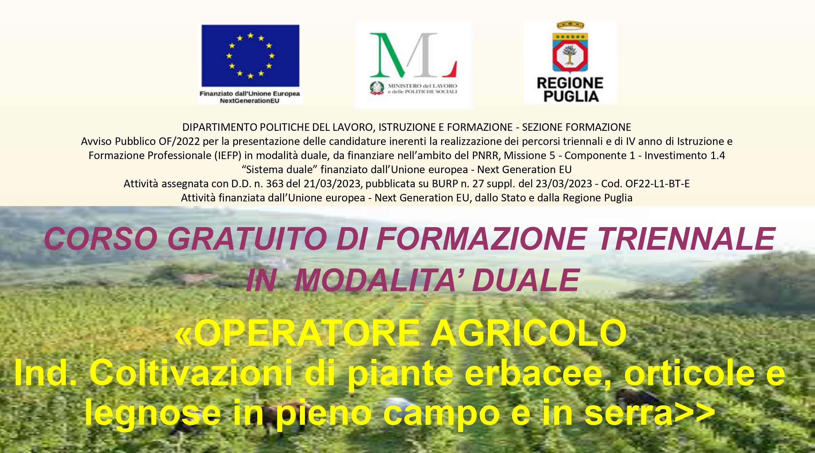 E’ in procinto di partire, c/o l’Agenzia Formativa En.A.P. Puglia di Corato, il corso "TECNICO DELLE PRODUZIONI ALIMENTARI – ind. Produzione Bevande" finalizzato all’acquisizione del Diploma Professionale IeFP IV anno e rivolto a ragazzi fino a 25 anni in possesso della Qualifica Professionale di “Operatore della trasformazione agroalimentare – ind. Vitivinicoltura”