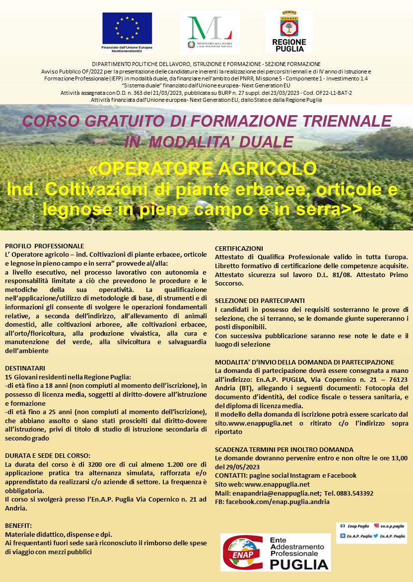 Il corso si svolgerà presso l’En.A.P. Puglia Via Copernico n. 21 ad Andria.