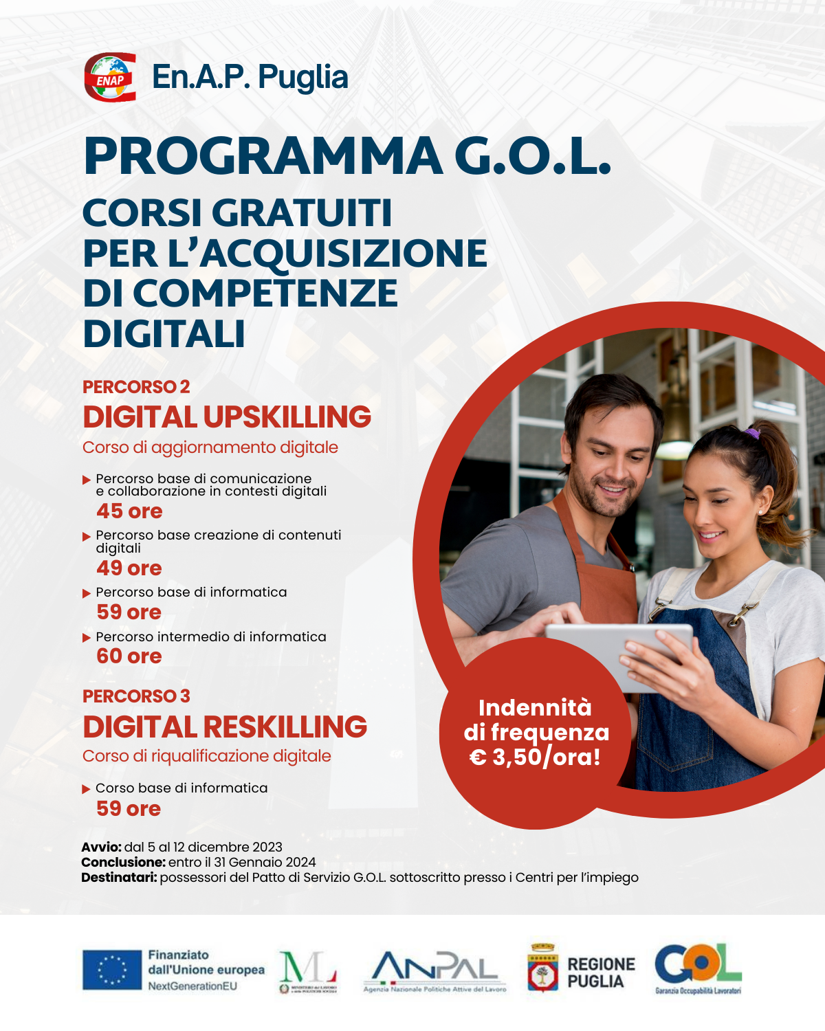 Dal 5 al 12 dicembre 2023 l’En.A.P. Puglia, in ciascuna delle proprie Agenzie Formative, avvierà i corsi per l’acquisizione di competenze digitali nell’ambito del Percorso 2 Aggiornamento (upskilling) e del Percorso 3 Riqualificazione (reskilling).