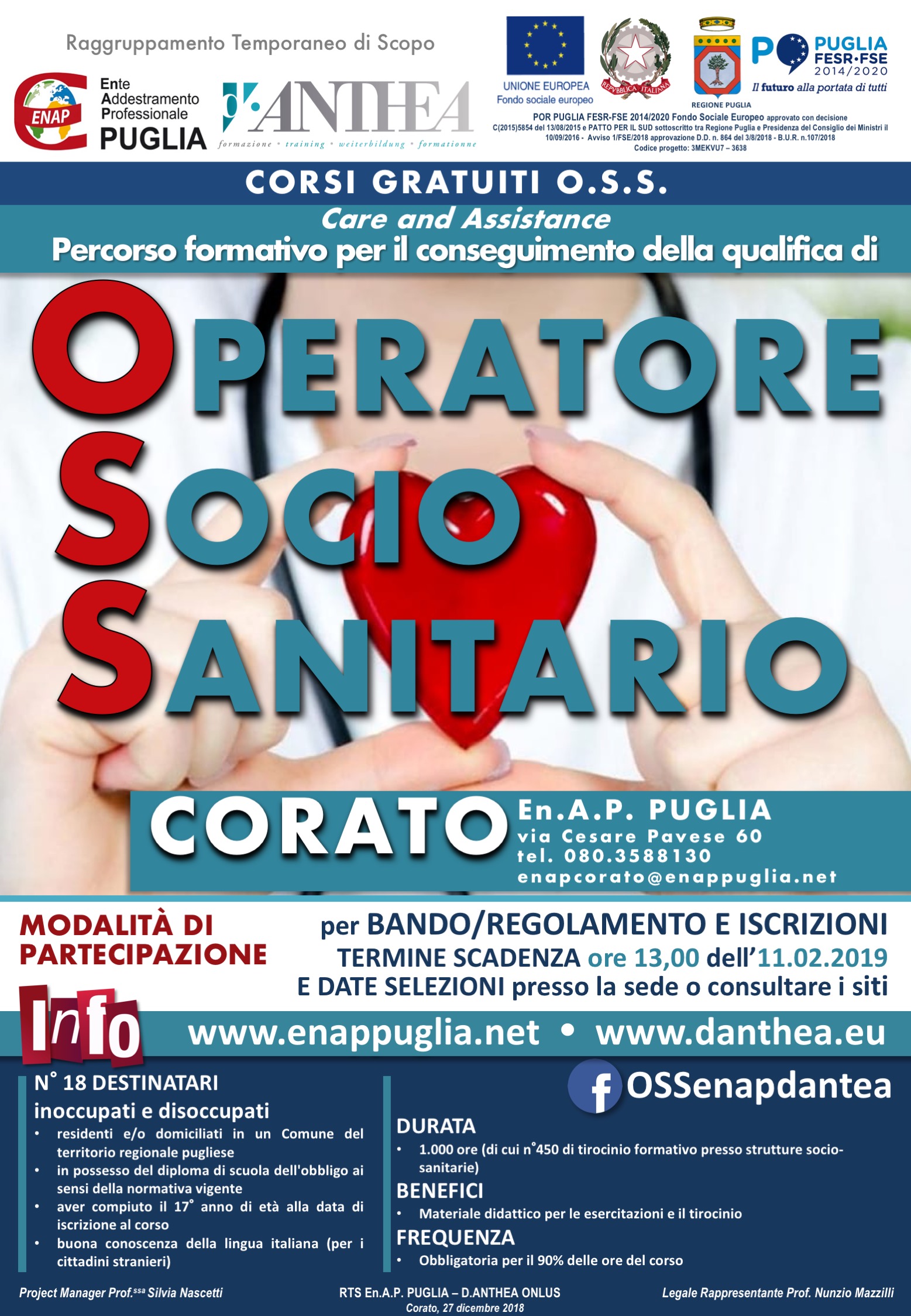 In data 27 dicembre 2018 il RTS En.A.P. PUGLIA – D.ANTHEA ONLUS ha pubblicato il BANDO/REGOLAMENTO per la presentazione delle DOMANDE DI PARTECIPAZIONE alle PROVE DI SELEZIONE dei corsi gratuiti di qualifica per OPERATORE SOCIO SANITARIO.
