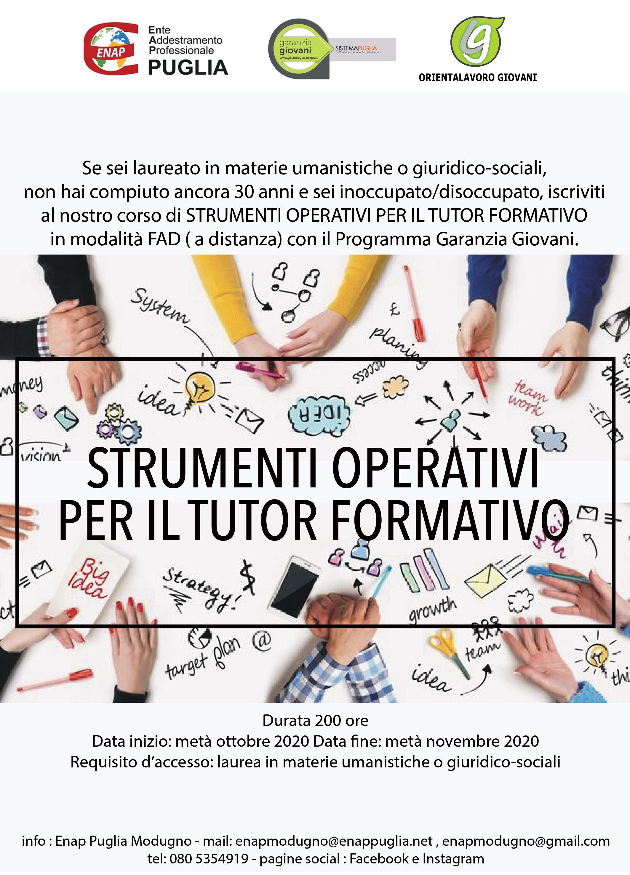Iscriviti al nostro corso per Tutor formativi, al termine, superato l’esame finale, potrai accedere all’Albo dei Tutor e collaborare con l’En.A.P. Puglia.