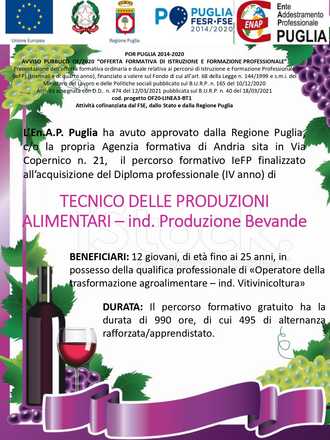 Possiedi la qualifica professionale conseguita in un percorso triennale IeFp o a scuola di “Operatore della trasformazione agroalimentare – ind. Vitivinicoltura”? Iscriviti al corso gratuito in partenza c/o l’Agenzia Formativa En.A.P. Puglia di Andria e conseguirai il Diploma Professionale IeFP IV anno di “Tecnico delle Produzione Alimentari – ind. Produzione bevande”. Il Diploma ti consentirà di accedere al V° anno di scuola superiore