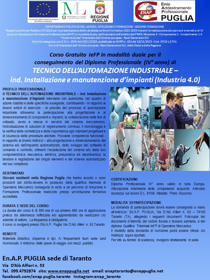 E' in procinto di essere avviato il corso gratuito per l'acquisizione del Diploma Professionale di IV° anno di Tecnico dell'Automazione industriale ind. installazione e manutenzione d'impianti" rivolto a Giovani, residenti nella Regione Puglia, in possesso di qualifica triennale IeFP di "Operatore Meccanico " conseguito c/o un organismo formativo accreditato.