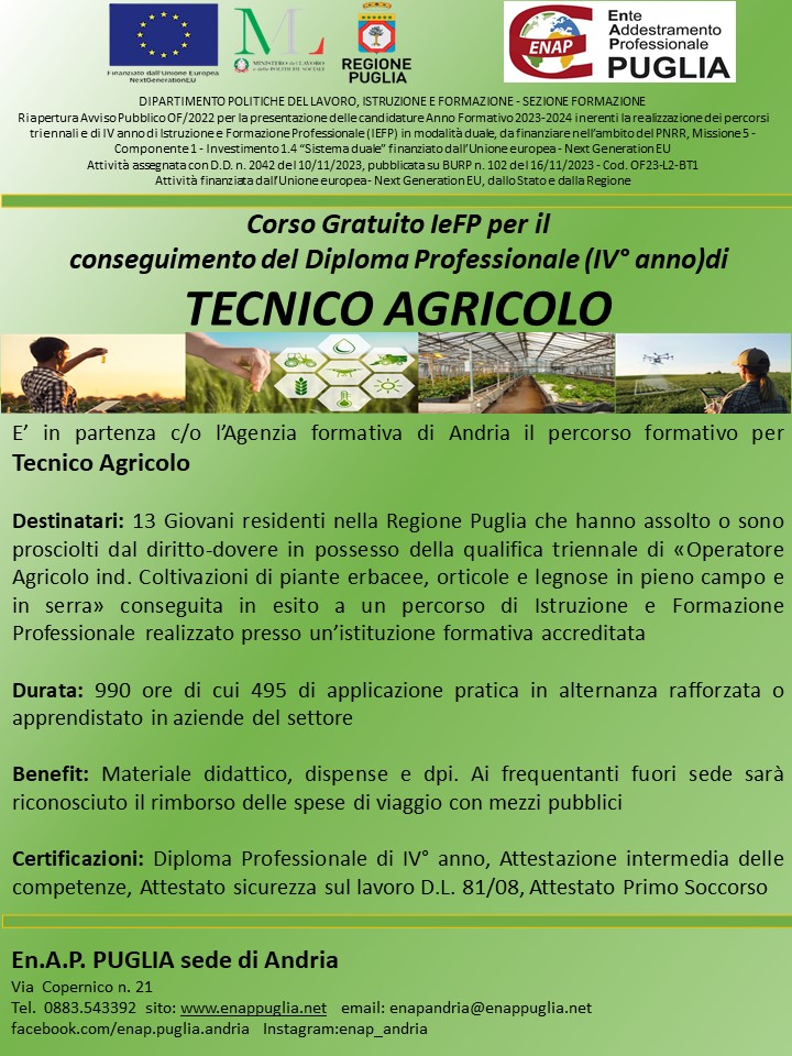 In partenza il corso gratuito per l'acquisizione del Diploma Professionale di IV° anno di Tecnico Agricolo rivolto a Giovani, residenti nella Regione Puglia, in possesso di qualifica triennale IeFP di "Operatore Agricolo - ind. Coltivazioni di piante erbacee, orticole e legnose in pieno campo e in serra " conseguito c/o un organismo formativo accreditato.