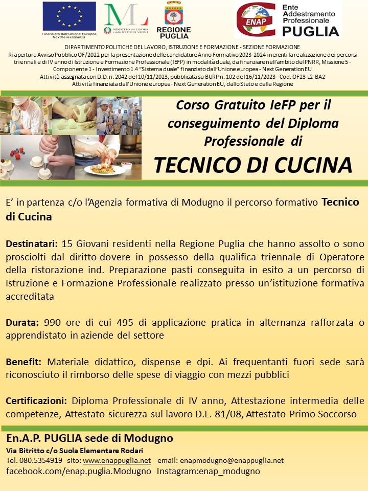In partenza il corso gratuito per l'acquisizione del Diploma Professionale di IV° anno di Tecnico di Cucina rivolto a Giovani, residenti nella Regione Puglia, in possesso di qualifica triennale IeFP di "Operatore della ristorazione - ind. preparazione pasti" conseguito c/o un organismo formativo accreditato.