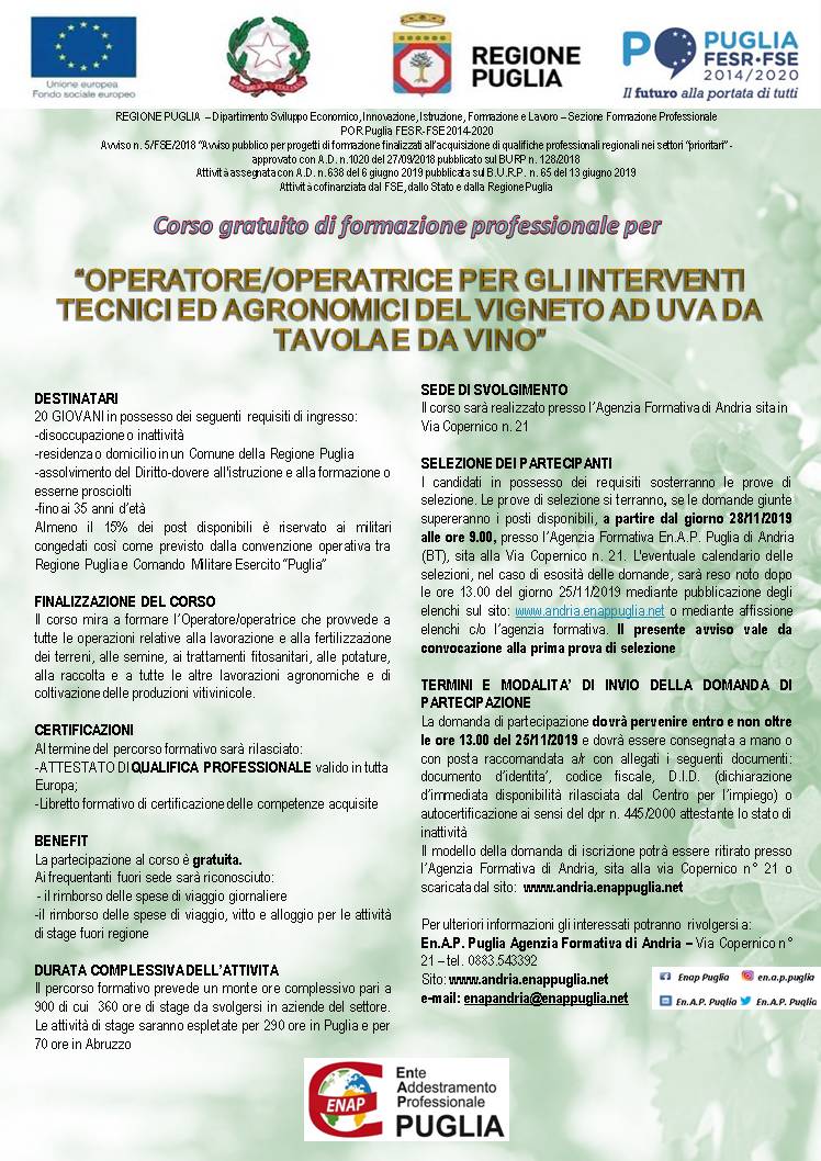 Il corso mira a formare l'Operatore/Operatrice che provvede a tutte le operazioni relative alla lavorazione e alla fertilizzazione dei terreni, alle semine, ai trattamenti fitosanitari, alle potature, alla raccolta e a tutte le altre lavorazioni agronomiche e di coltivazione delle produzioni vitivinicole.