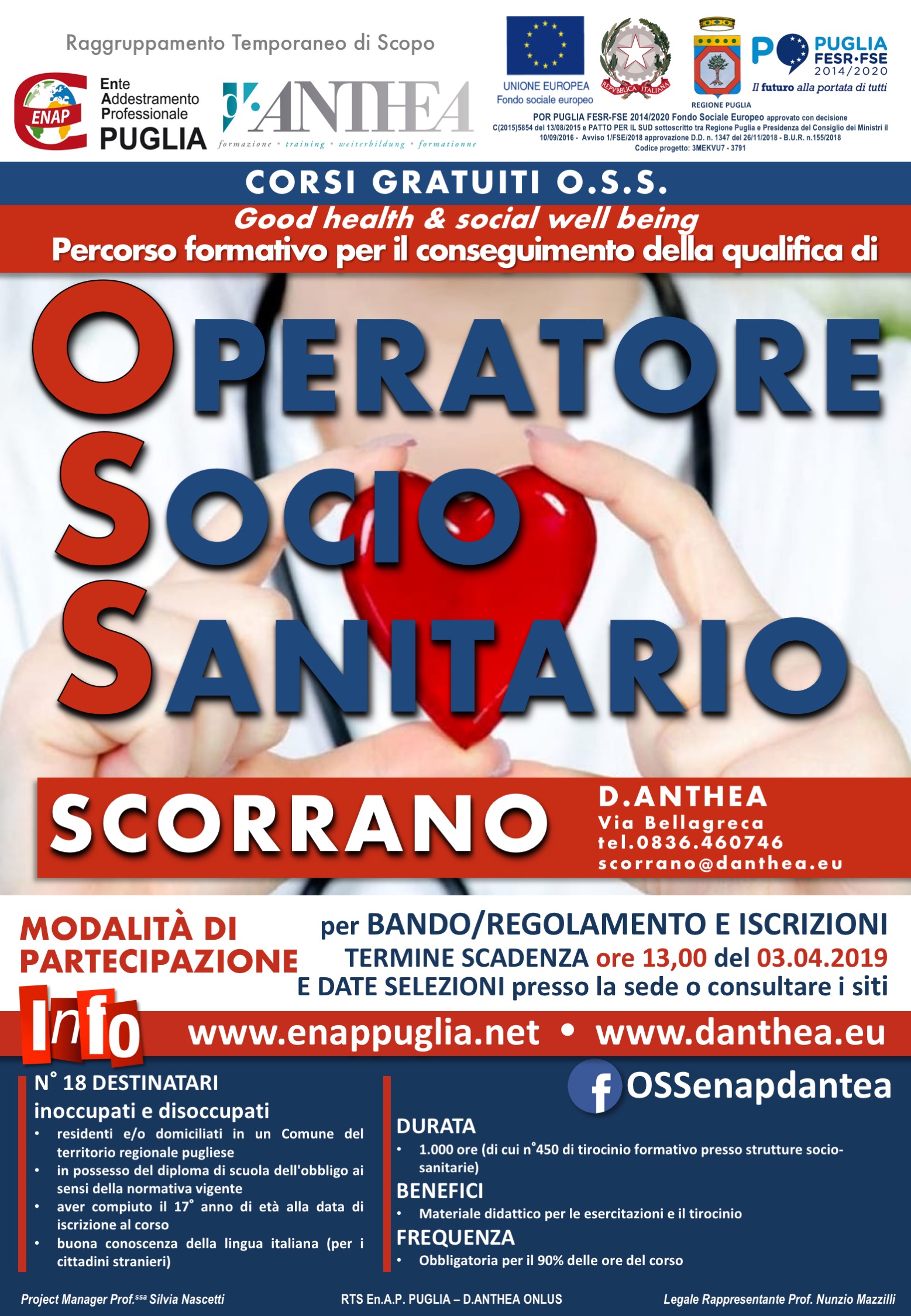 In data 27 dicembre 2018 il RTS En.A.P. PUGLIA – D.ANTHEA ONLUS ha pubblicato il BANDO/REGOLAMENTO per la presentazione delle DOMANDE DI PARTECIPAZIONE alle PROVE DI SELEZIONE dei corsi gratuiti di qualifica per OPERATORE SOCIO SANITARIO.