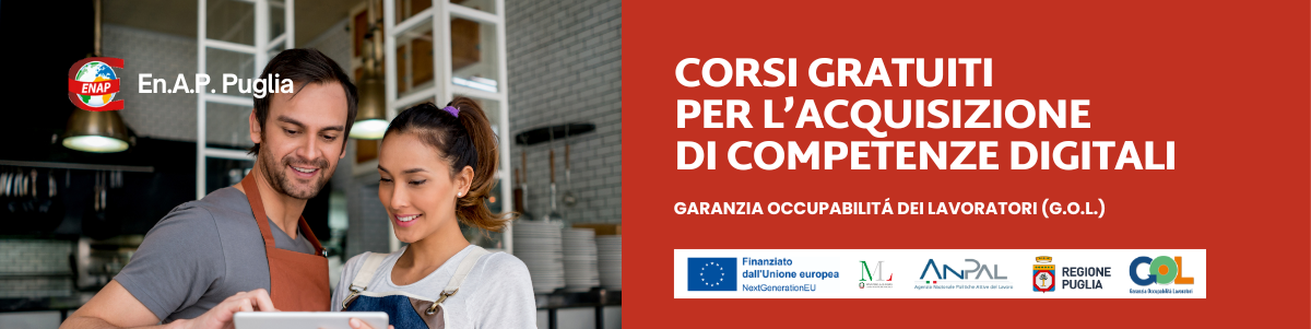 Dal 5 al 12 dicembre 2023 l’En.A.P. Puglia, in ciascuna delle proprie Agenzie Formative, avvierà i corsi per l’acquisizione di competenze digitali nell’ambito del Percorso 2 Aggiornamento (upskilling) e del Percorso 3 Riqualificazione (reskilling).