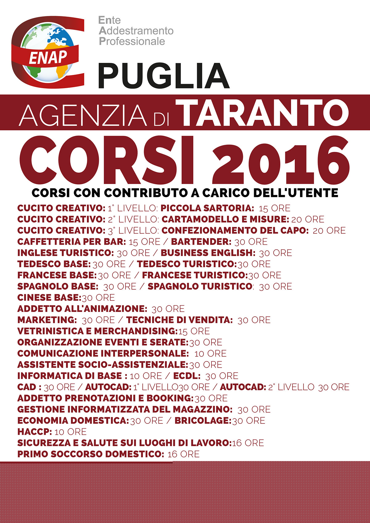 Vi troverete corsi adatti a tutti, che spaziano in tantissime areaa di attività: dalla cucina al marketing, dal cucito creativo alle lingue straniere, e altro ancora, a soddisfare il desiderio di apprendimento di ciascuno, affiancati da docenti qualificati.